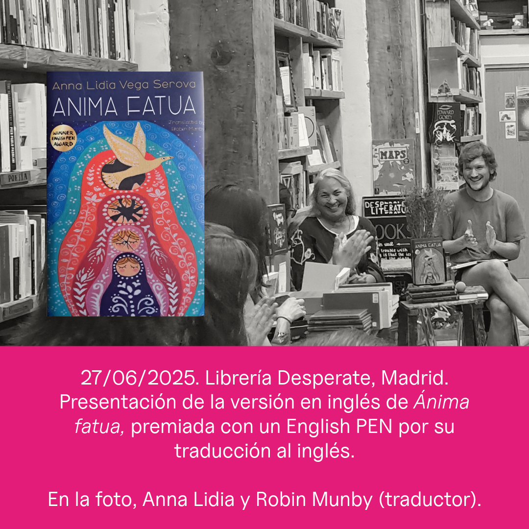 Además, durante el verano de 2025 tuvimos la suerte de ser testigos de la presentación que se hizo en la librería Desperate de Madrid. Pudimos ver a traductor y autora hablando de la novela. Lo pasamos como enanas. También fue en esos días cuando conocimos a Anna, claro. Cuando dijimos: A JIERRO CON ESTO. SOMOS PEQUEÑITAS, PERO VAMOS A JIERRO CON ESTO, ANNA.